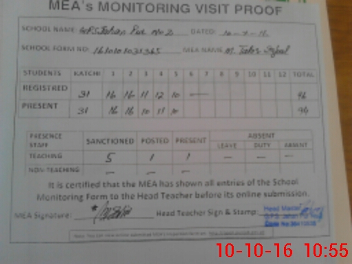 | Monitoring Date: 10-10-2016 | Start Time: 10-10-2016 10:31 AM | End Time: 10-10-2016 11:00 AM | Name of MEA: M.Ta**** Iq**** (S**** | |