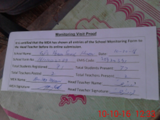 | Attendance Register | Head Teacher | MEA with School | Visit Proof |