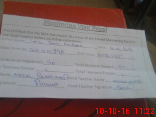 | Attendance Register | Head Teacher | MEA with School | Visit Proof |