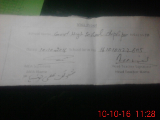 | School Visited by School Health & Nutrition Supervisor (No. of Visits) | 1 | Name1: | MUHAMMAD ZAMAZ QAMER | Name2: | |