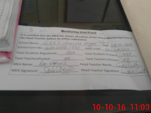 | Attendance Register | Head Teacher | MEA with School | Visit Proof |