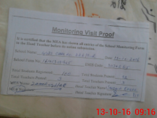 | Attendance Register | Head Teacher | MEA with School | Visit Proof |