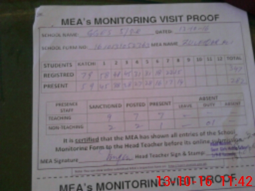 | Attendance Register | Head Teacher | MEA with School | Visit Proof |