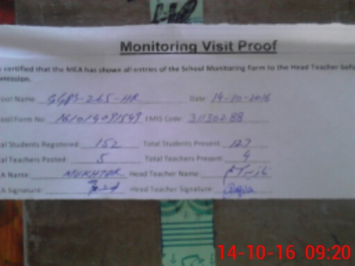 | EMIS Code: 31130288 | Name of School: GGPS CHAK NO 265 HR | |||