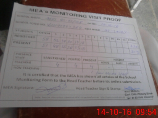 | Attendance Register | Head Teacher | MEA with School | Visit Proof |