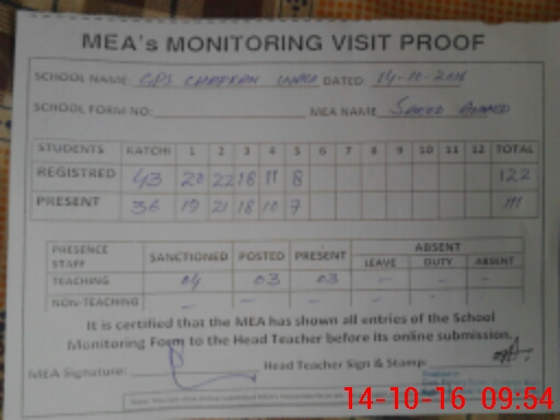 | Attendance Register | Head Teacher | MEA with School | Visit Proof |