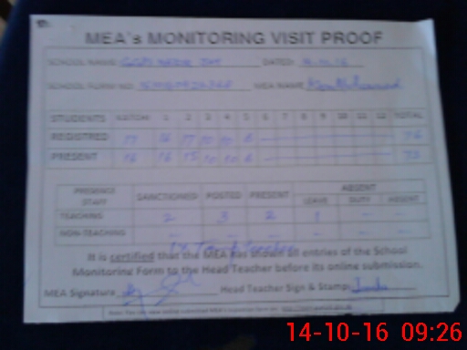 | Attendance Register | Head Teacher | MEA with School | Visit Proof |