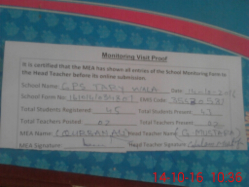 | EMIS Code: 35430581 | Name of School: GPS TARY WALA | |||