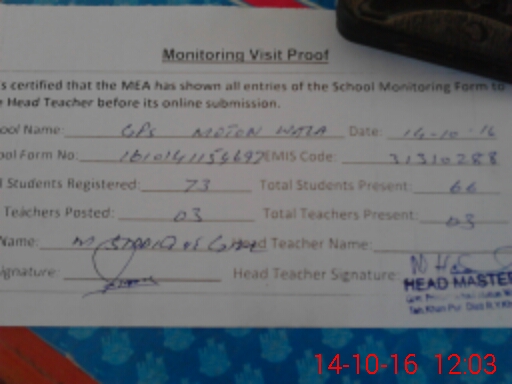 | Certified that this School was Inspected by the Undersigned MEA/DMO Today and the Information Stated Above is as Per Record. | |||||
