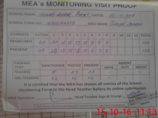 | Attendance Register | Head Teacher | MEA with School | Visit Proof |