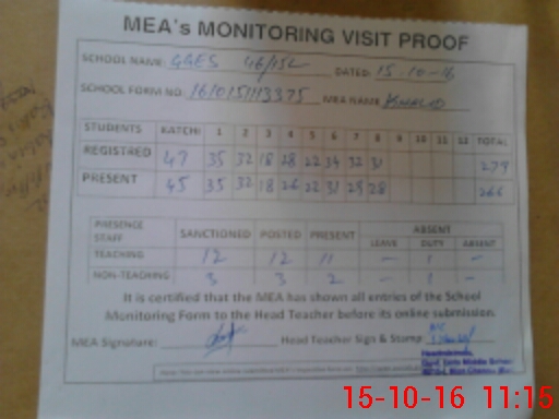 | Attendance Register | Head Teacher | MEA with School | Visit Proof |