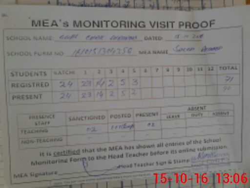 | Attendance Register | Head Teacher | MEA with School | Visit Proof |