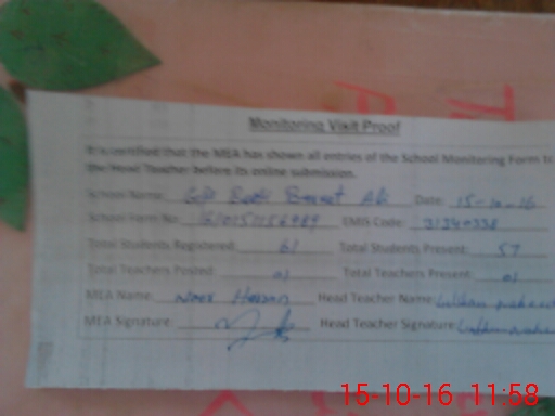 | Attendance Register | Head Teacher | MEA with School | Visit Proof |