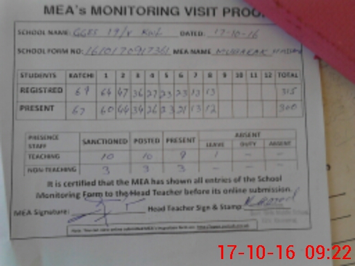 | Attendance Register | Head Teacher | MEA with School | Visit Proof |