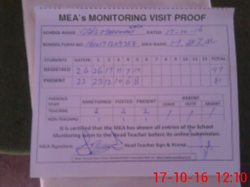 | Attendance Register | Head Teacher | MEA with School | Visit Proof |