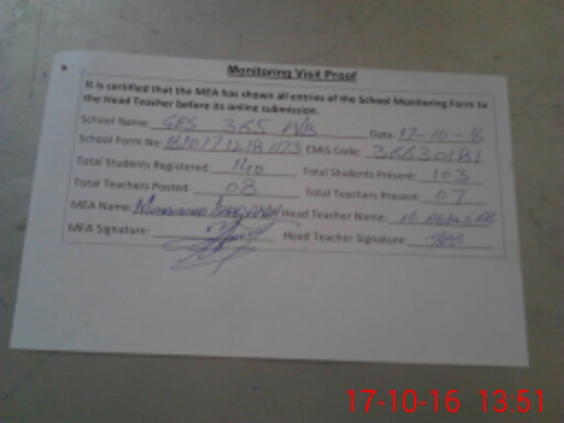 | School Visited by School Health & Nutrition Supervisor (No. of Visits) | Name1: | MuhammadMujahidLatif | Name2: | ||