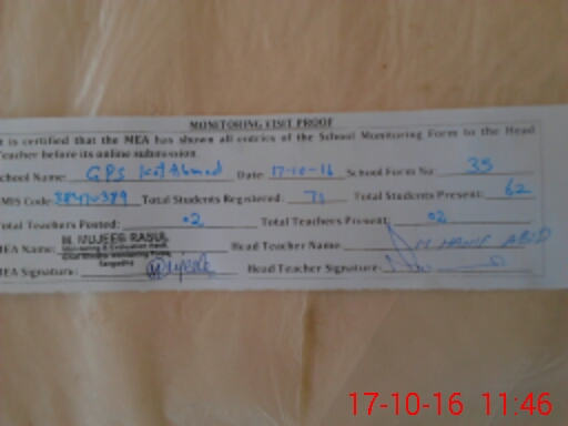 | Attendance Register | Head Teacher | MEA with School | Visit Proof |