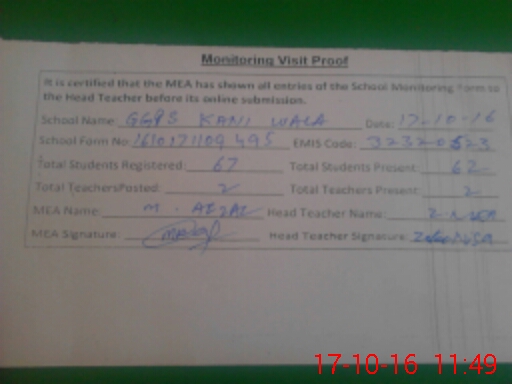 | EMIS Code: 32320523 | Name of School: GGPS KANI WALA | |||