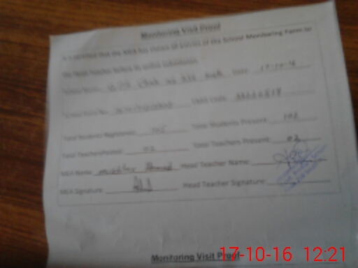 | Attendance Register | Head Teacher | MEA with School | Visit Proof |