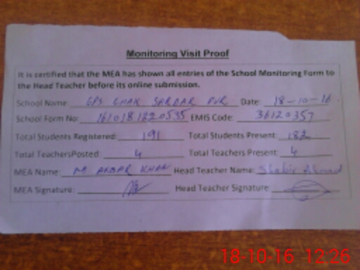 | EMIS Code: 36120357 | Name of School: GPS CHAK SARDAR PUR MOZA SHAH PUR UBHA | |||