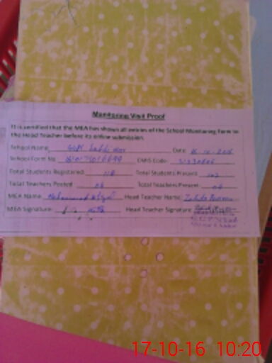 | Attendance Register | Head Teacher | MEA with School | Visit Proof |