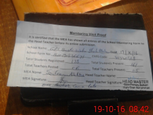 | Attendance Register | Head Teacher | MEA with School | Visit Proof |