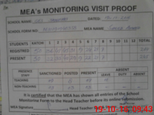 | Attendance Register | Head Teacher | MEA with School | Visit Proof |