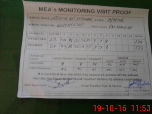 | Attendance Register | Head Teacher | MEA with School | Visit Proof |