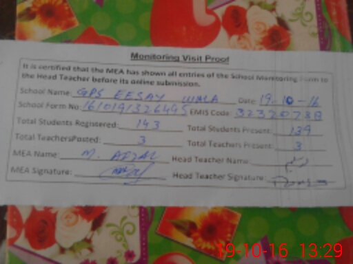 | EMIS Code: 32320738 | Name of School: GPS EESAY WALA | |||