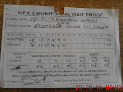 | Attendance Register | Head Teacher | MEA with School | Visit Proof |
