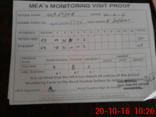 | Attendance Register | Head Teacher | MEA with School | Visit Proof |