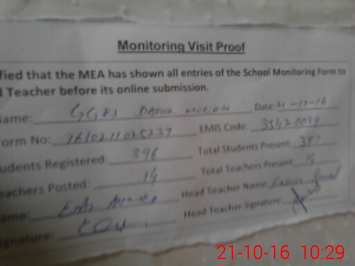 | Certified that this School was Inspected by the Undersigned MEA/DMO Today and the Information Stated Above is as Per Record. | |||||