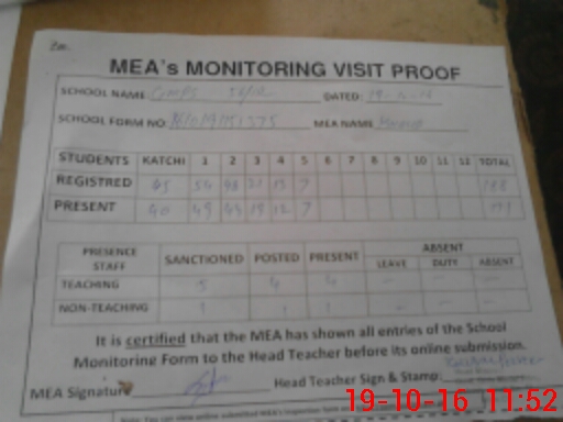 | Attendance Register | Head Teacher | MEA with School | Visit Proof |