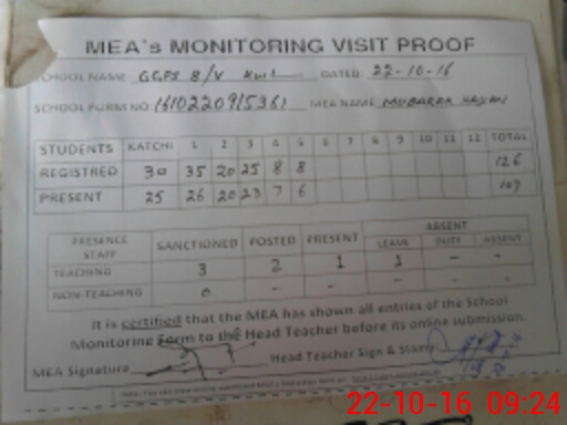 | Attendance Register | Head Teacher | MEA with School | Visit Proof |