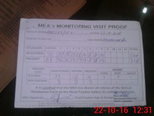 | Attendance Register | Head Teacher | MEA with School | Visit Proof |