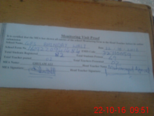 | EMIS Code: 32310059 | Name of School: GPS BHINDAY WALI | |||