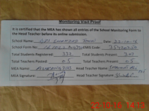 | EMIS Code: 35420250 | Name of School: GPS SHAHZAD TOWN | |||