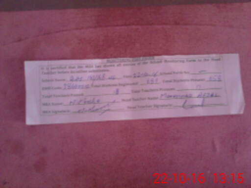 | Name: Im**** Ah**** Designation: (School Headmaster's/Headmistress's) Snr H/M Phone/Cell Number: 03**** |