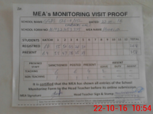 | Attendance Register | Head Teacher | MEA with School | Visit Proof |