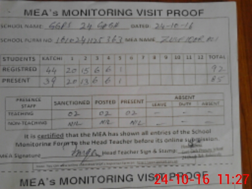 | Attendance Register | Head Teacher | MEA with School | Visit Proof |