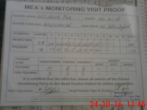 | Attendance Register | Head Teacher | MEA with School | Visit Proof |