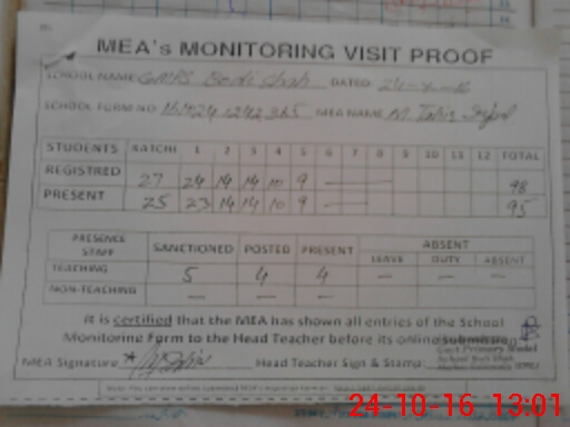 | Attendance Register | Head Teacher | MEA with School | Visit Proof |