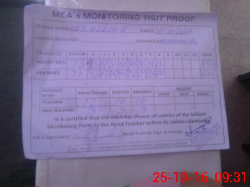 | Attendance Register | Head Teacher | MEA with School | Visit Proof |
