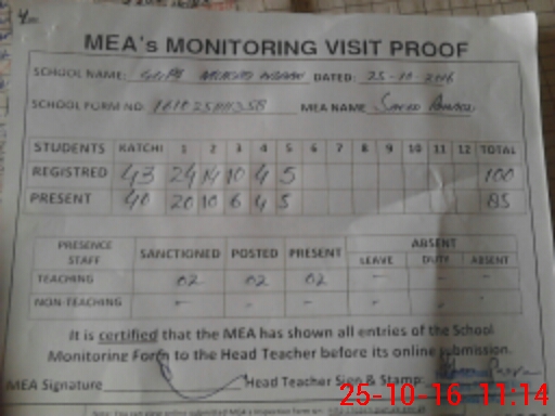 | Attendance Register | Head Teacher | MEA with School | Visit Proof |