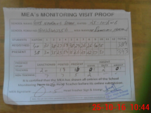 | Attendance Register | Head Teacher | MEA with School | Visit Proof |