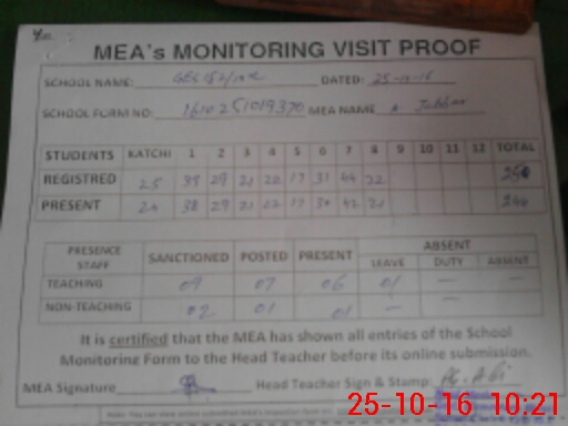 | Attendance Register | Head Teacher | MEA with School | Visit Proof |