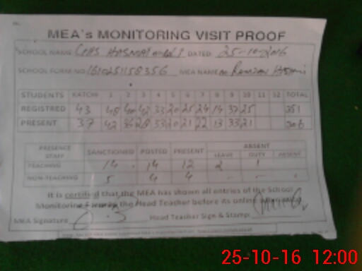 | Attendance Register | Head Teacher | MEA with School | Visit Proof |