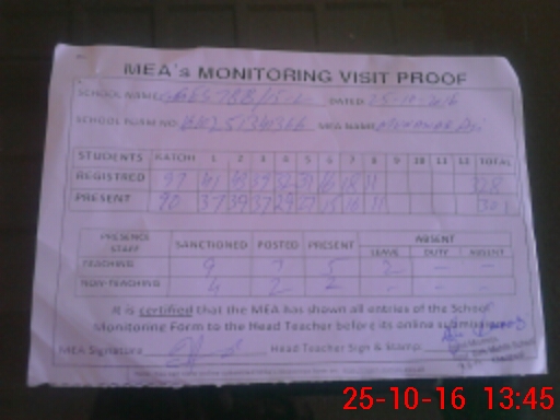 | Attendance Register | Head Teacher | MEA with School | Visit Proof |