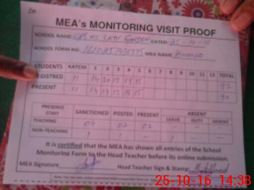 | Attendance Register | Head Teacher | MEA with School | Visit Proof |