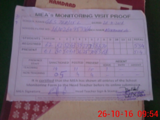 | Attendance Register | Head Teacher | MEA with School | Visit Proof |